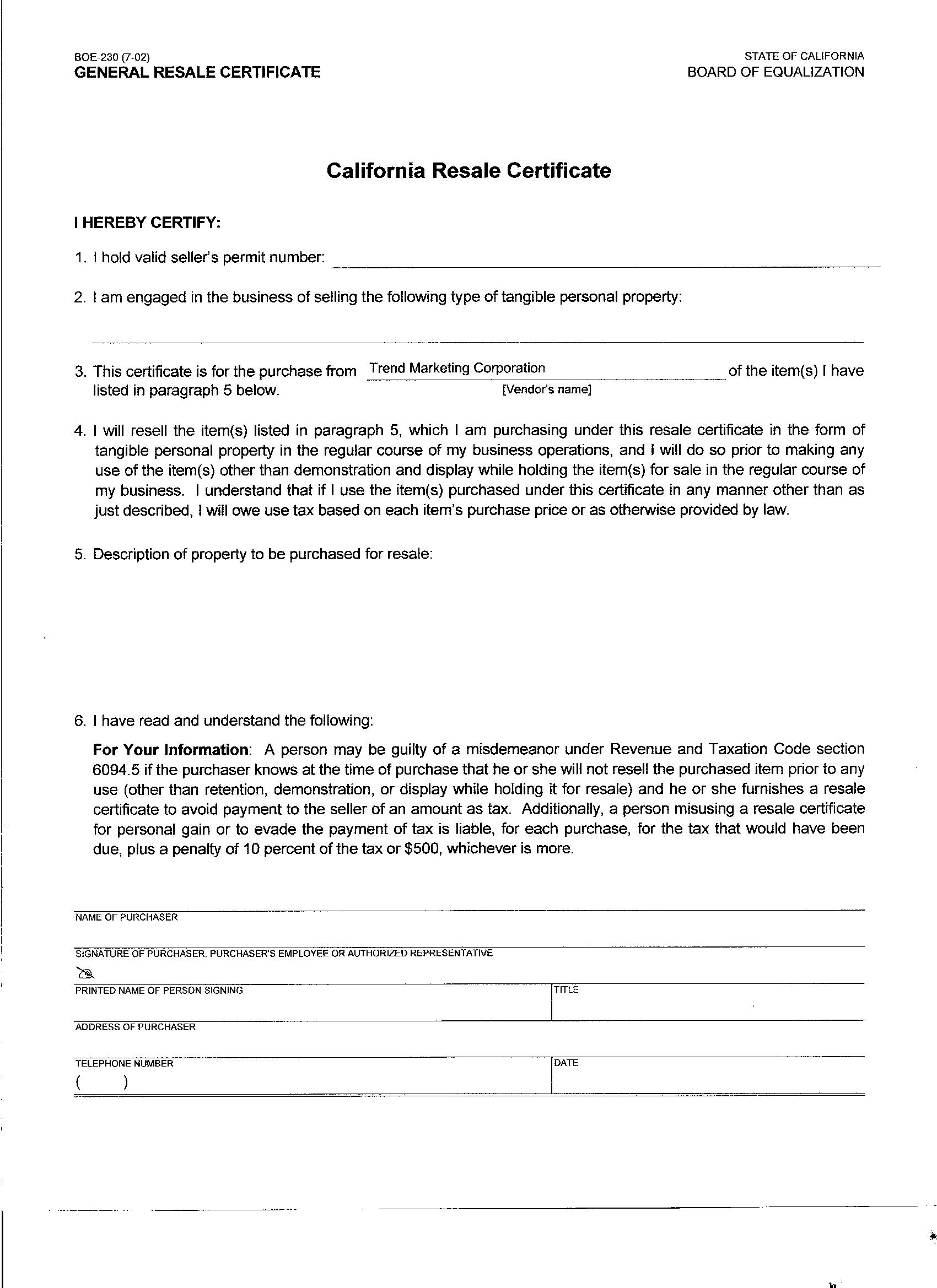 California Resale Certificate